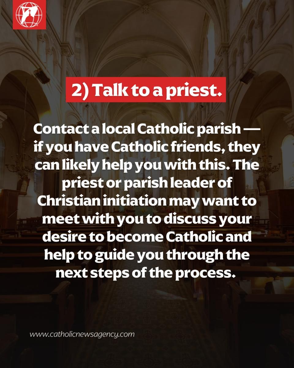 For more helpful infomation, we encourage you to read THIS ARTICLE from Ascension Press where it goes a bit more in depth to the different steps on becoming Catholic.