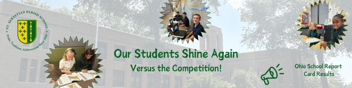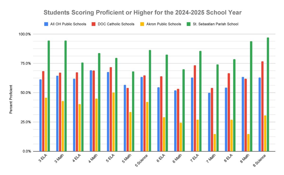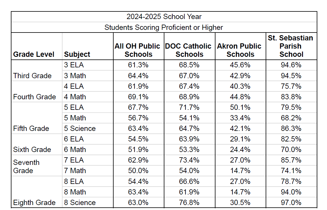 St. Sebastian Parish School once again demonstrated academic excellence on the latest proficiency benchmarks, outperforming Ohio Public Schools, the Diocese of Cleveland Catholic Schools, and Akron Public Schools in every tested grade and subject. While continuing our tradition of high academic achievement, St. Sebastian Parish School maintains a high-quality formation and education program, helping students grow in mind, body, and spirit. St. Sebastian Parish School outperformed Ohio’s public schools and the Diocese of Cleveland’s Catholic Schools average proficiency scores in every grade level, including 14 of the 14 tested subjects/grades reported on Ohio’s public school report cards.