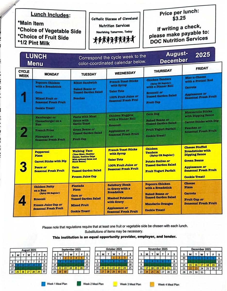 Please fill out a new order form each month with the day(s) your student will be ordering. Please make all checks payable to Diocese of Cleveland Nutrition Services.